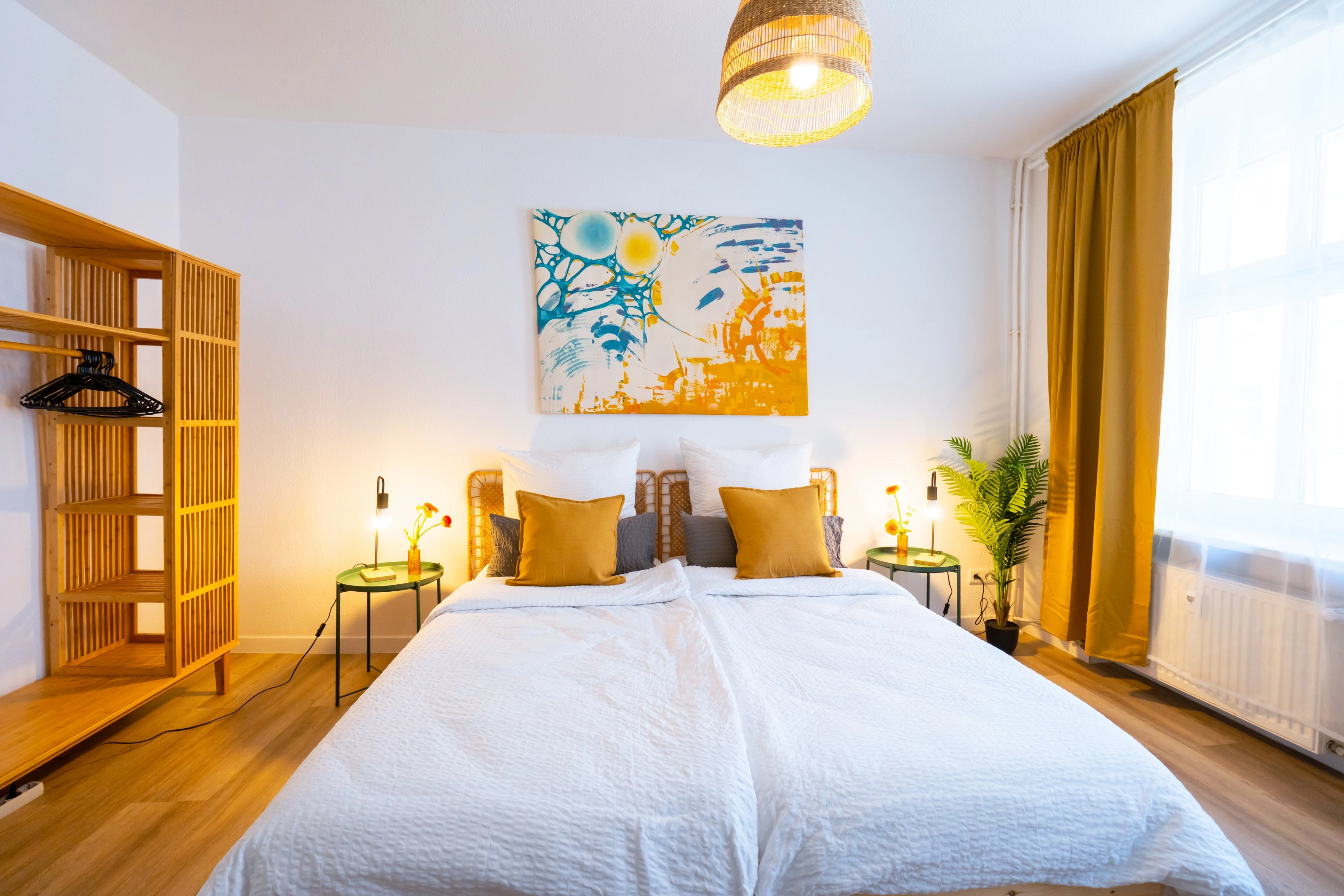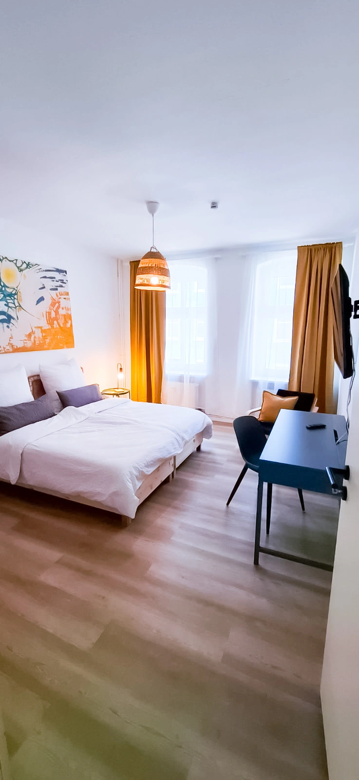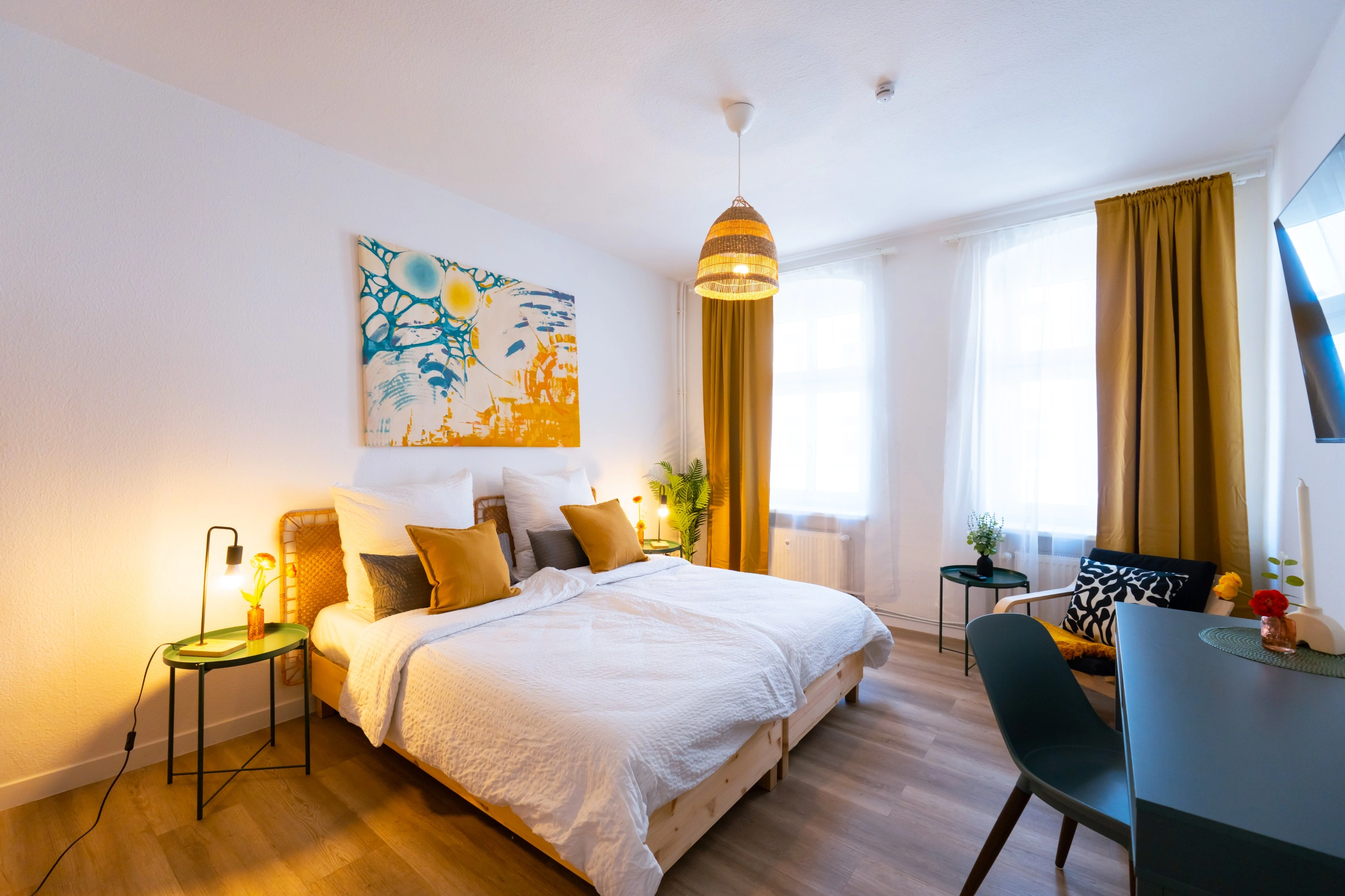 Wohnung war Stilvoll eingerichtet und die Betten sehr gut. Dazu alles geräumig gehalten. Fernseher hatte ein großes Bild. Und jedes Schlafzimmer hatte einen eigenen kleinen Schreibtisch. Dazu ein 2 Platten Induktionsfeld für die Küche. Die Bahn fast vor der Tür bringt einen Einfach ins Zentrum von Berlin.